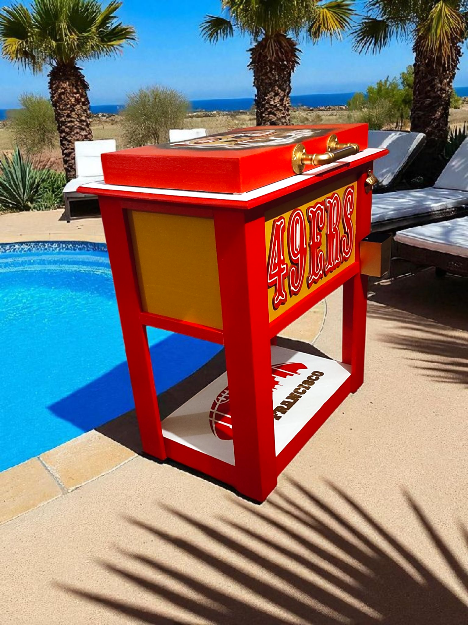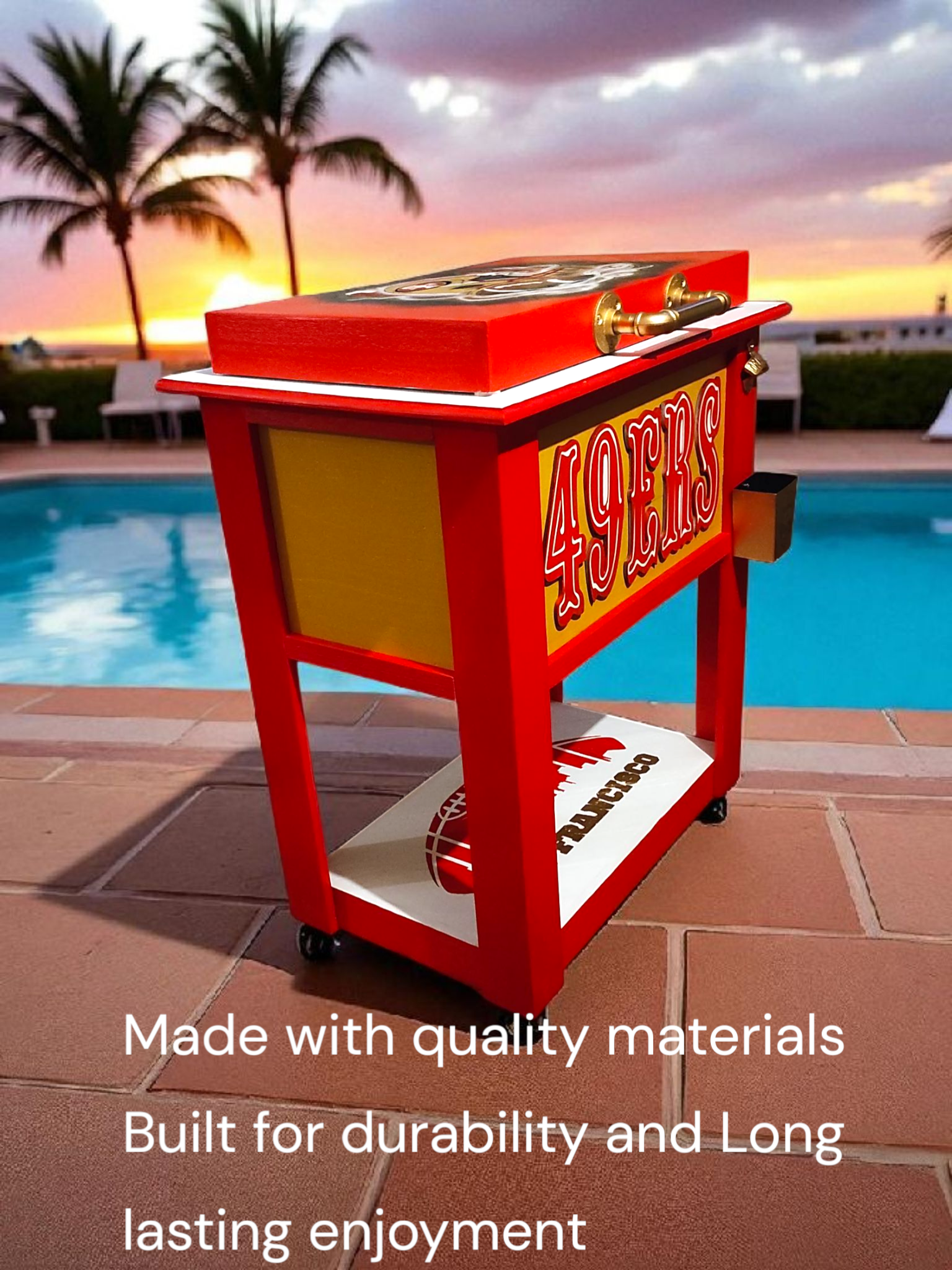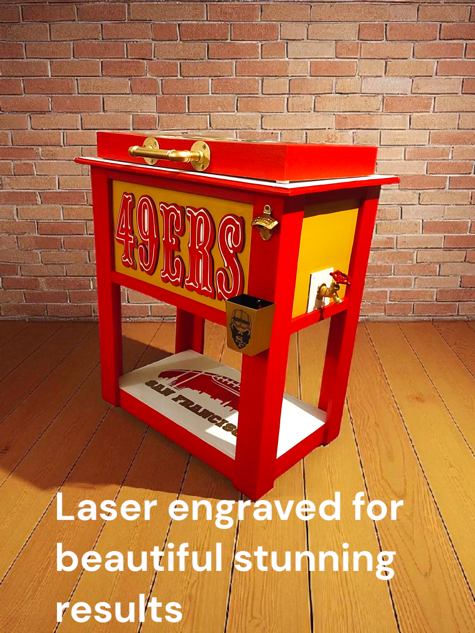 It is beautifully handcrafted laser engraved 49ers custom cooler. Made to order and can be personalized. Concert was a 48 quart iglue cooler cast iron bottle opener bottle cap catcher and bottom shelf for extra storage. Made with quality cedar wood , very durable,solid build for years of use and enjoyment.Comes with water spigot to drain water easily.